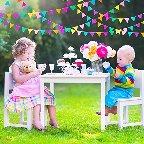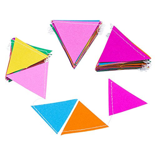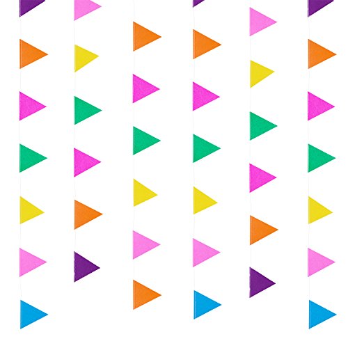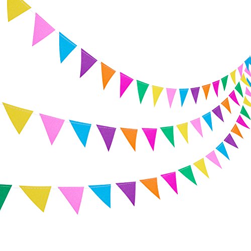 -. Feature : Quantity: 3 pack; Total Length: 10.5 m/ 34.5 feet, each string of banner measures 3.5 m/ 11.5 feet long; Each pennant size is 6.5 x 6.1 cm/ 2.56 x 2.4 inch (L x H) / 7 Color paper flags: color patterns repeat yellow, green, blue, pink, rose red, orange and purple, colorful enough for celebratory occasions / Easy to use: easy to unfold and hang up, can bring fun and surP.R.Ise for party with these double sided colorful hanging decorations / Usage: hang from the ceiling, above a table, under the verandah, from branches in trees, or in a doorway, window, archway, decorate your festival celebration and event party / Suitable for many occasions: fit for birthday party, baby shower, wedding, festival streamers, tea party, outdoor decoration, home decoration, etc.