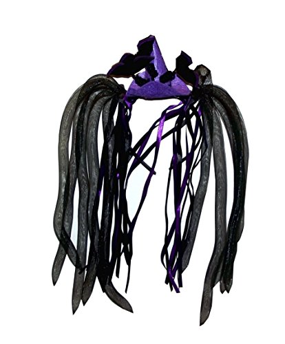 - Halloween Party Headband Featuring Spider Leg-Like Appendages and Black and Purple Ribbon on Either Side of a Felt Witch Hat with Glitter Bats Sprouting Up from the Band
