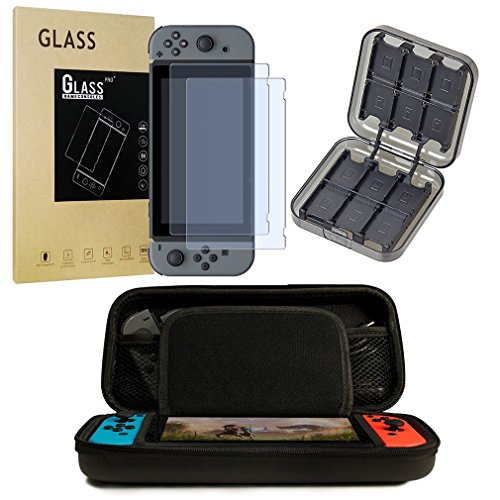 -. Feature : Nintendo Switch Accessory 3 IN 1Set: 2PCS HD Nintendo Switch Tempered Glass Screen Protectors + Hard Shell Carrying Case Bags for Nintendo Switch +Card Storage Box / SCREEN PROTECTORS-2PC Nintendo Switch Tempered Glass Screen protector Ultra thin-0.3mm thickness is reliable and resilient, and promises full compatibility with touch screen sensitivity and to fit in your Nintendo Switch case. / Nintendo Switch Carrying CASES - Carrying Cases for Nintendo Switch ,The high quality and durable shell protects your Nintendo Switch from accidental bumps, impact and drops. The soft fannel interior prevent your console from being scratched and everyday wear and tear. / Nintendo Switch Card storage Box-2 layer storage sheets with 12 Game Card Holders,independent card ports to place your game cards and Micro SD Cards. / Nintendo switch console Compatible: Works While Docking, The screen protector will not interfere with the docking system. Ultra thin-0.3mm thickness is reliable and resiliant, and promises full compatibility with touchscreen sensitivity. Easy installation and no residue when removed.