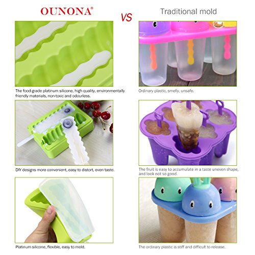 - High quality food-grade silicone. Unlike hard plastic, silicone is a flexible, rubbery material. The same material as baby’s pacifiers, built to last.FDA approved, safety, health and environmental. OUNONA popsicle mold helps reduce waste with eco-friendly reusable design. You can use them again and again in the freezer for years to come.