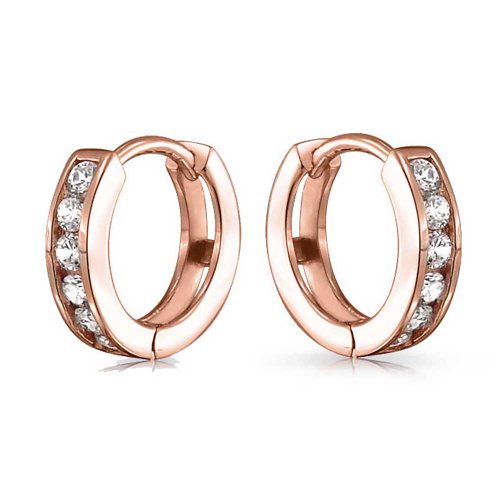 If you are looking for a fashionable small Rose Gold Plated hoop earring that is perfect for just about every occasion, look no further for the perfect piece of Rose Gold Plated jewelry. These Rose Gold Plated huggie hoop earrings will add a very pretty accent to any outfit. They are sophisticated, yet simply styled and will work very well with either a daytime or an evening look. Our CZ huggie hoop earrings are made entirely in 925 sterling silver and plated in Rose Gold Plated. They are accented with six clear, sparkling, round CZs for added glitz. A fashionable hoop for every occasion, they fit well and are very lightweight to wear, and feature an open design in the back. Each opens easily on a hinge and snaps firmly back into place, so that it fits securely in the ear. Gold Plated hoops for women make great gifts for the stylish lady on your gift list.Feature