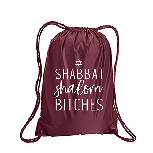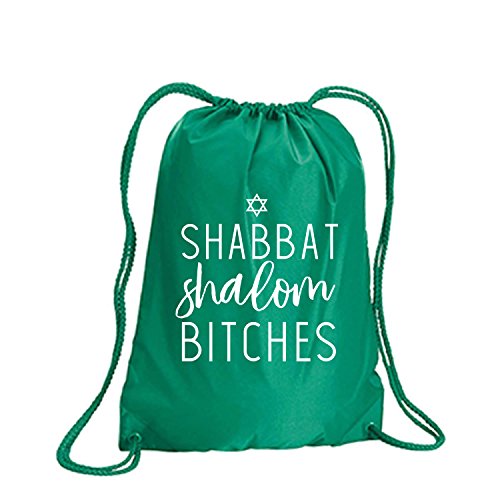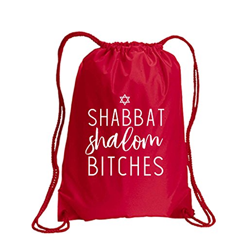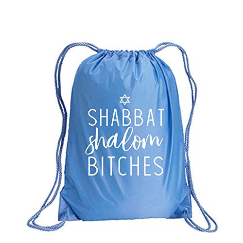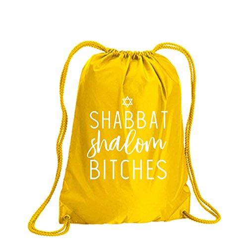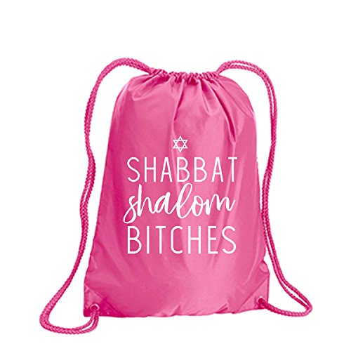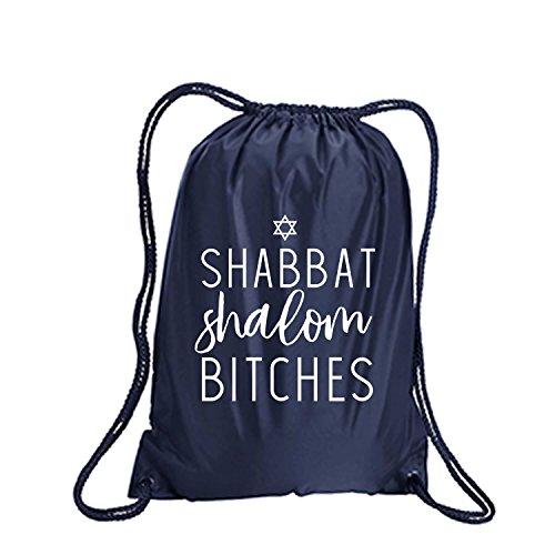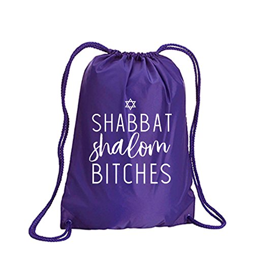 Product Description This durable and stylish nylon tote features "Shabbat Shalom Bitches" on a cinch pack tote with white ink. Bag comes in small and large sizes and is made of a durable 210 Denier nylon and has color-matched draw cords. Printed in the USA on an imported bag. 0