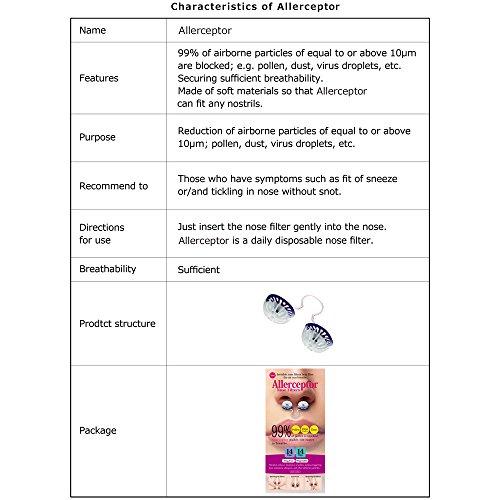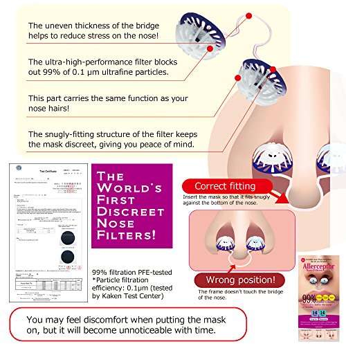 -. Feature : Made in Japan, Materials: Filter/ polyester, Main Body/ elastomer (soft material), Frame/ polypropylene / Dimentions of Merchandise : Diameter of 0.45in x Length of 0.3in (can be distorted to some extent to fit the shape of nostrils) / Content: 14Pairs / Filters that can block upto 99% of equal to or above 10㎛ particles are used. Approved by JSIF(Japan Spinner's Inspecting Foundation) / Just by inserting Nose Filters into your nostrils, the filtration reduces daily inhaled pollen, virus droplets, dust, etc. Especially recommended for those who don't want to use medicines or conventional facial masks.