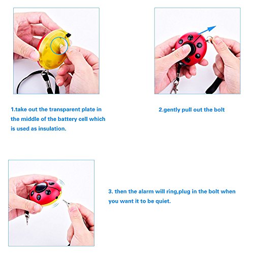 -. Feature : LOUD ALARM: You can use in different area, when and where you are,with 120 dB alarm helps call for assistance in an emergency and helps deter attacker, if you need help or in troubles, use this amazing alarm. / CONVENIENCE USE: Keychain design is perfect suit for women,kids,elders.Easy to carry. When you meet any problem or emergency,just pull out the bolt. And plug in the bolt when you want it be quiet. Also it suit for house keys or car keys. / PORTABLE- Dimension: 2.68*1.5*0.98inch, it can either be worn around your wrist or attached to your keychain to make it easily accessible. / GIFT CHOICE- great gift for your relatives, friends or child who may walks to and from the bus stop alone or live alone for protection. / PERFECT DECORATION: Tiny product designed, and hardly be drawn attention by attackers or intruders, perfect to be a handbag decoration usually.