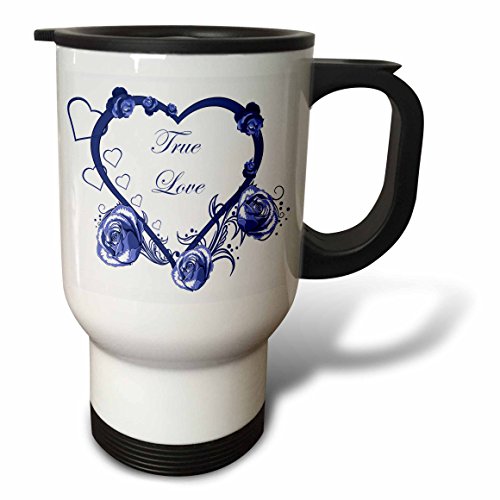 3dRose tm_152798_1 A Blue Heart with Roses & The Words True Love Stainless Steel Travel Mug, 14 oz, White