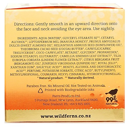 -. Feature : From the new Wild Ferns Manuka Range / With pure New Zealand Manuka Honey / A 99.5% natural face cream / Cruelty-free, no parabens or mineral oil / Replaces old Wild Ferns Night Revival Cream