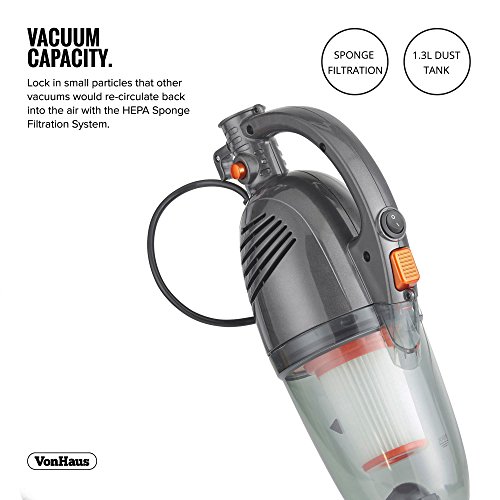 Designed with difficult spaces in mind, the VonHaus 600W 2-in-1 Stick Vacuum takes the hard work out of cleaning those areas which always seem just out of reach. Featuring a super lightweight construction and a low profile base, the Stick Vacuum makes cleaning these areas an absolute breeze. Taking care of other areas which are notoriously difficult to reach, such as stairs, under the bed and around furniture, is also incredibly pain-with the Stick Vacuum. Simply detach the extension tube with the swift push of a button and you have yourself a compact handheld vacuum which will allow you to tackle previously troublesome areas with ease. Intuitive Design Convenience is high on the agenda with the VonHaus 2-in-1 Stick Vacuum, which features a completely bagless design. Removable transparent dust cup is quick and easy to empty, and relieves you of the tedious and messy task of changing a bag. Thanks to its 1.3L tank, the VonHaus Stick Vacuum lets you vacuum for longer without the need to frequently empty. 19.5 Foot quick release power cord provides easy access to all areas. Smooth Operation The fully rotatable wheels offers smooth operation, which not only makes vacuuming simpler and faster, but more enjoyable too. The vacuum also comes complete with a handy crevice tool - the ultimate accessory for tackling even the most awkward of spaces. Suitable for use on most floor types. Contents: • Vacuum Cleaner • Standard Brush Head • Hose • Crevice Tool • Upholstery Brush • Telescopic Handle • HEPA FilterFeature