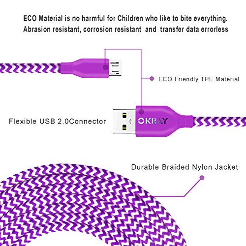 OKRAY 3 Pack 10ft 3M High Speed Braided Nylon Tangle-Free Micro USB 2.0 Charger Cable Sync Charger Charging Cord for Android, Samsung Galaxy, HTC, Google Nexus, Sony, Nokia, LG (Blue Orange Purple)