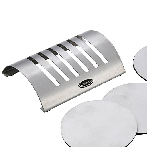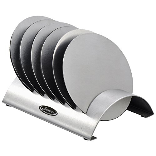 -. Title : Cup Coasters, Newness Cup Coasters Set with Decorative Rack, Stainless Steel Tabletop Display Round Cup Coaster with Holder, Silver, Set of 6