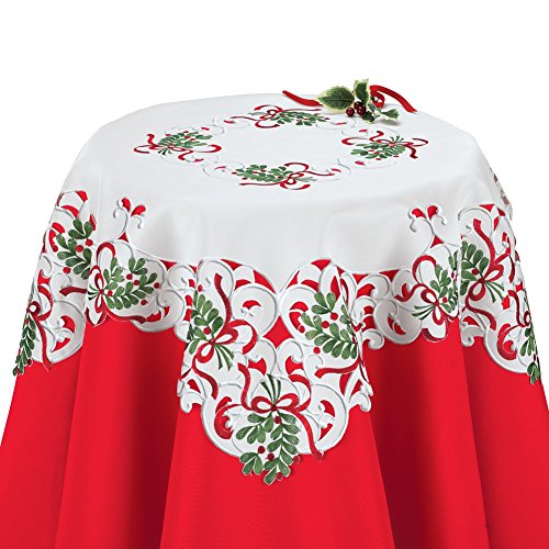 -. Feature : Table linens feature exquisite embroidery and lacy openwork / Design includes embroidered mistletoe tied with red ribbon, a beautiful scrolling pattern and scalloped edges / Machine washable. Made from polyester / Available either as a Runner (68"L x 13 3/4"W) or as a Square (34"Sq.) / Shop with confidence! For over 50 years, Collections Etc has been bringing unique, whimsical, inspirational, and home solution products to customers. All Collections Etc products come with a 60 day, easy return policy and 100% satisfaction guarantee