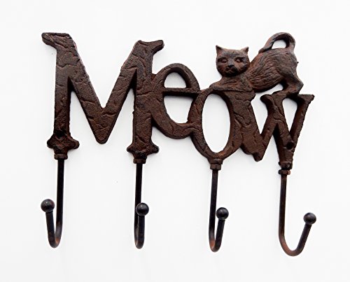 - Cat on "Meow" design solid wall hanger four hookS in brown color vintage or rusty looking - durable to use for hanging key chain, scarf, shirt, necklace and whatever light things you want to hang on it. SCREWS AND DRY WALL ANCHORS ARE INCLUDED.