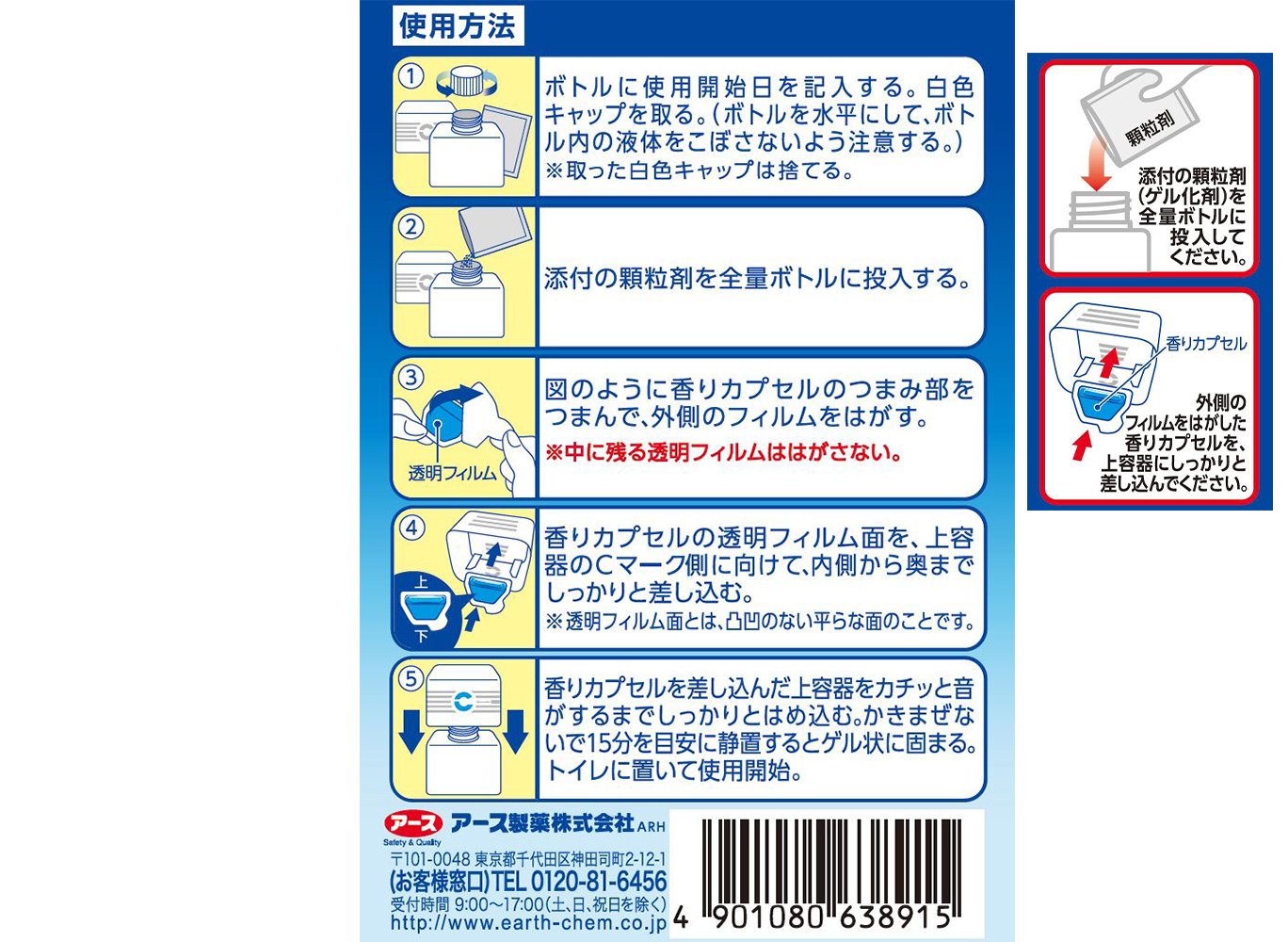 · Masking deodorization due to chemical deodorization by chlorine dioxide and scent of mint, deodorizes unpleasant odor of the toilet.