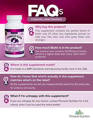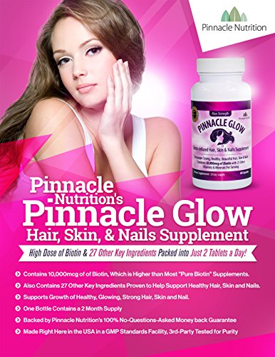 -. Binding : Health and Beauty -. Brand : Pinnacle Nutrition -. EAN : 0642345996862 -. Feature : 26 REASONS TO LOOK BETTER & FEEL BETTER: Pinnacle Glow delivers a super-effective daily dose of 26 carefully chosen ingredients to make sure your hair, nails and skin look and feel incredible. We deliver more natural and quality ingrediants than any other hair, skin and nail supplement available! / REAL "ONCE-DAILY" SUPPLEMENT: Many "one-a-day" supplements are misleading, and you end up having to take 6 or 7 pills at a time. With Pinnacle Glow you only need to take two pills once per day to start seeing the changes you want to see in your hair, skin and nails. / HEALTHY, GLOWING, CLEAN AND STRONG: Pinnacle Glow is the quickest, easiest and most pain-free way to begin repairing weak, damaged and embarrassing disorders in your skin, nails and hair and because it's natural there are no nasty side-effects. / SUPER-BIOTIN: Pinnacle Glow contains a higher dosage of Biotin than many "pure biotin" products with 10,000mcg of Biotin! Biotin is completely safe and you'll find can really help prevent and help with conditions like brittle nails, hair loss, and skin disorders. In addition it is widely sought after to help increase hair and nail growth. The biotin is the "star" of our supplement and is backed by 25 other natural "supporting player" ingredients to guarantee you'll get the best results in the shortest amount of time! / PRODUCT UPDATE - - WE HAVE UPGRADED FROM TABLETS TO CAPSULES, NO MORE "SMELLY" TABLETS! --- UNCONDITIONAL MONEYBACK GUARANTEE: 100% natural, research-based supplementation backed by an unconditional money back guarantee from Pinnacle Nutrition so you can confidently invest in Pinnacle Glow and start enjoying beautiful hair, nails and skin today.*****DON'T FORGET YOUR FREE EBOOK!***** Included With Each Order is Our "At-Home Spa" Tips & Tricks ebook ($12.99 value)! Customer Love it, and So Will You! It's not sold anywhere else online or in stores; it's only included to our customers as a fun "thank-you" for choosing Pinnacle Nutrition! -. IsAdultProduct : 0 -. Label : Pinnacle Nutrition -. LegalDisclaimer : The statements on this page have not been evaluated by the Food and Drug Administration. This product is not intended to diagnose, treat, cure or prevent any disease. -. Manufacturer : Pinnacle Nutrition -. MPN : pn_hsn_120 -. PackageQuantity : 1 -. PartNumber : pn_hsn_120 -. ProductGroup : Health and Beauty -. ProductTypeName : HEALTH_PERSONAL_CARE -. Publisher : Pinnacle Nutrition -. Studio : Pinnacle Nutrition -. Title : Extra-Strength 10,000mcg Biotin Hair Skin & Nails Growth Supplement - Capsules Packed w/ Biotin 10,000 mcg, Vitamin C, Vitamin E, Collagen, Pantothenic Acid, Hyaluronic Acid Astaxanthin & More, Moneyback Guarantee -. UPC : 642345996862