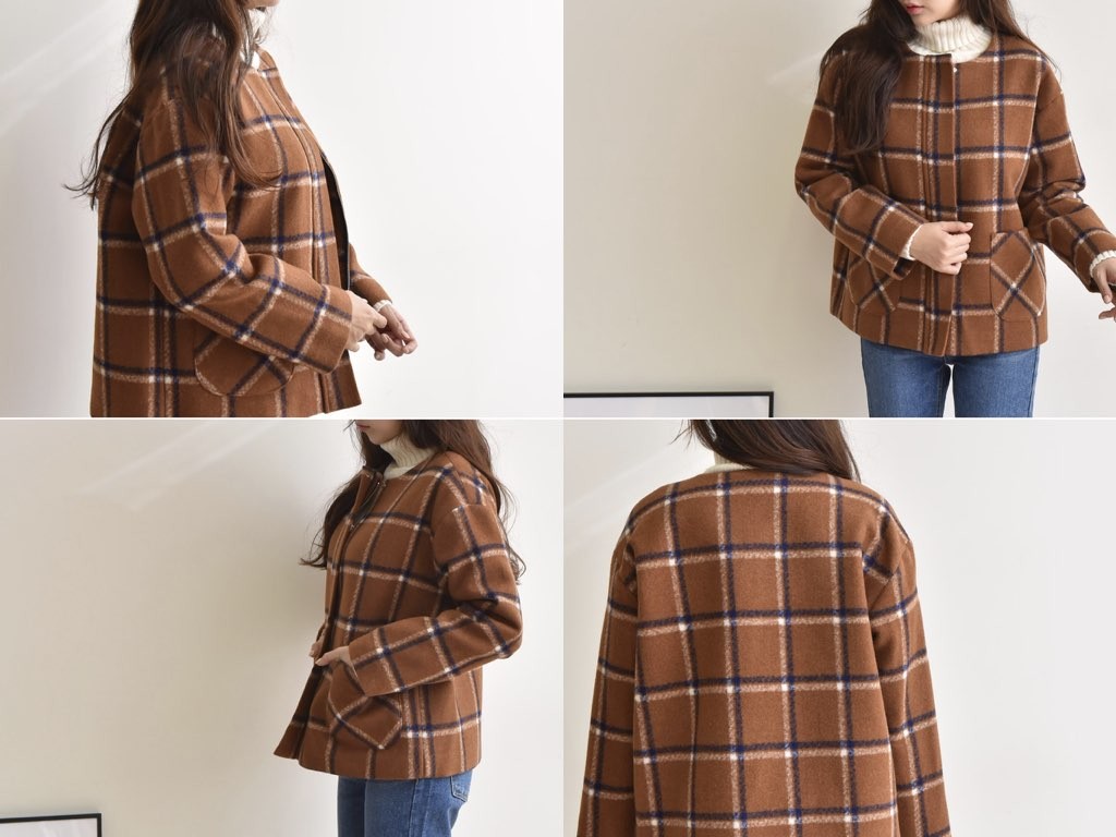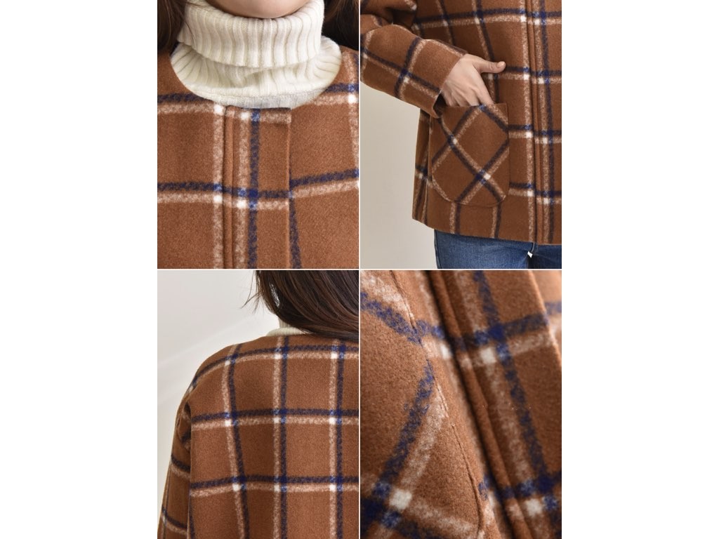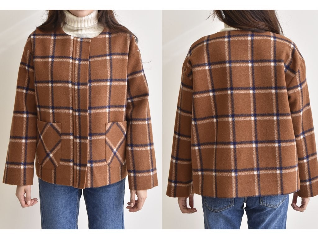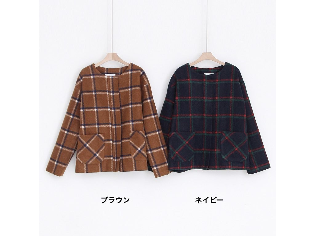 チェック柄のジャケットです。肌寒くなる秋冬は、季節に合った旬のアイテムを取り入れたいですよね。あたたかみのある「チェック柄」は、秋冬にオススメです。商品は、とても丁寧なつくりとなっています。1.基本情報色:2色展開(ブラウン/ネイビー)サイズ:Free素材:ウール混製造国:Korea2.サイズ情報肩幅:51cm身幅(胸断面):58cm 腕の長さ:53cm 着丈(前):65cm (サイズは計る方法に応じて±2〜3cmの誤差があります。ご了承お願い致します)モデル着用サイズ:F※着用モデル(163cm、体重47kg、足のサイズ24.5cm)3.その他の情報厚み:中間透け感:なし伸縮性:なし裏地:あり洗濯方法:ドライ(クリーニング)[注意事項]お取り寄せ商品は、海外より仕入れるため納品まで約10日前後いただきます。また店舗でも販売しており、在庫切れになる場合もございます。ご了承お願い致します。