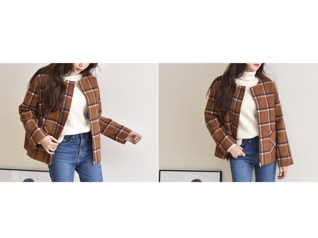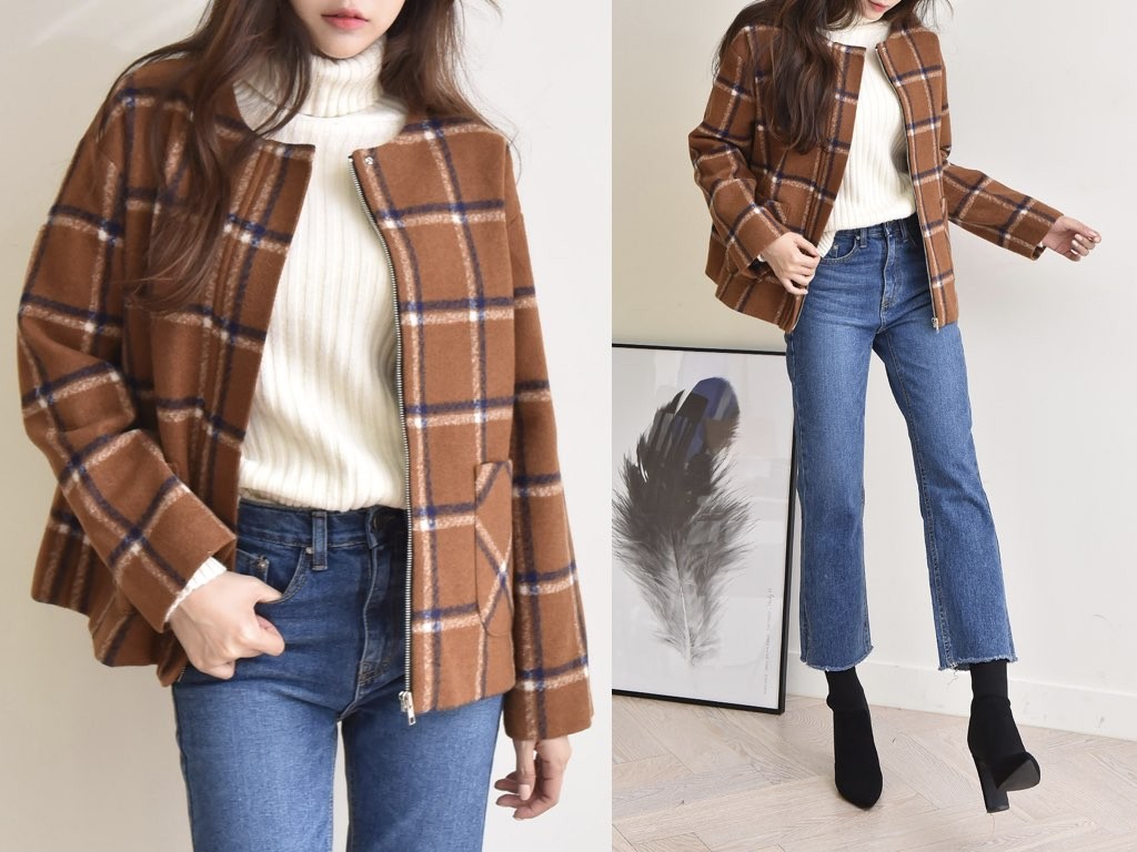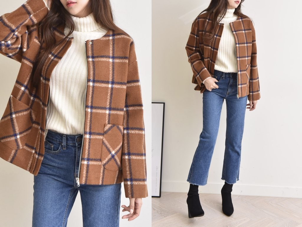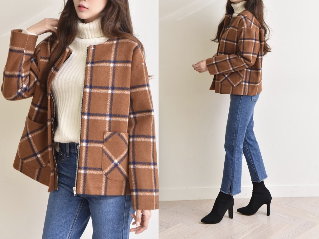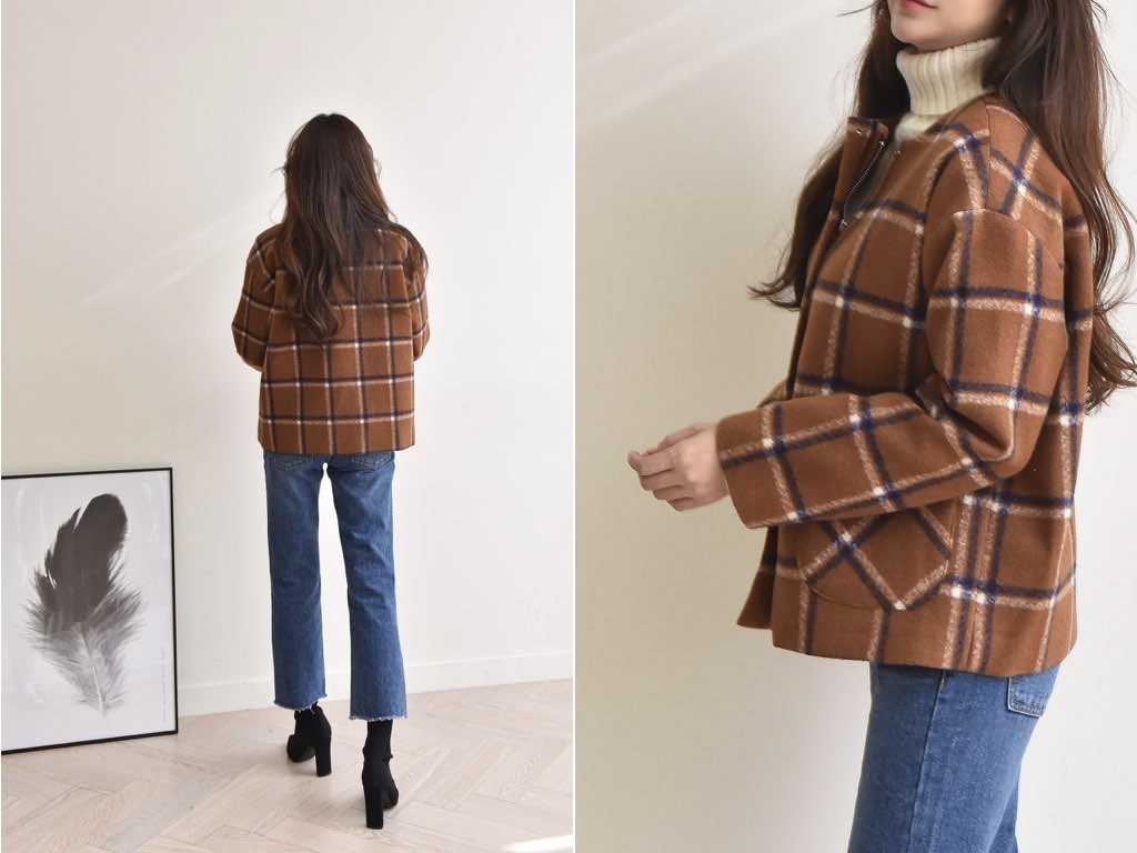 チェック柄のジャケットです。肌寒くなる秋冬は、季節に合った旬のアイテムを取り入れたいですよね。あたたかみのある「チェック柄」は、秋冬にオススメです。商品は、とても丁寧なつくりとなっています。1.基本情報色:2色展開(ブラウン/ネイビー)サイズ:Free素材:ウール混製造国:Korea2.サイズ情報肩幅:51cm身幅(胸断面):58cm 腕の長さ:53cm 着丈(前):65cm (サイズは計る方法に応じて±2〜3cmの誤差があります。ご了承お願い致します)モデル着用サイズ:F※着用モデル(163cm、体重47kg、足のサイズ24.5cm)3.その他の情報厚み:中間透け感:なし伸縮性:なし裏地:あり洗濯方法:ドライ(クリーニング)[注意事項]お取り寄せ商品は、海外より仕入れるため納品まで約10日前後いただきます。また店舗でも販売しており、在庫切れになる場合もございます。ご了承お願い致します。