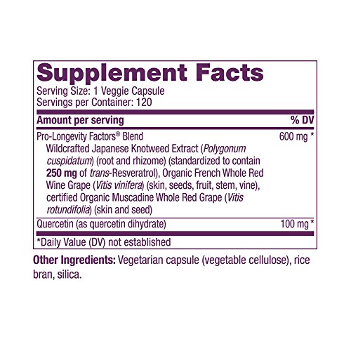 Reserveage Nutrition’s Resveratrol 250mg delivers antioxidant protection in our proprietary blend that combines the finest wildcrafted Japanese Knotweed Extract (Polygonum cuspidatum) (Standardized to 250mg trans-Resveratrol) combined with organic French red wine grapes and organic Muscadine grapes, along with Quercetin for enhanced bioactivity. Our award-winning Pro-Longevity Factors Blend is designed to support and help activate the SIRT1 ‘longevity gene’, provide cell rejuvenation and offer important antioxidant protection. Each capsule is standardized to contain 250mg of trans-Resveratrol and is free from unnecessary fillers.