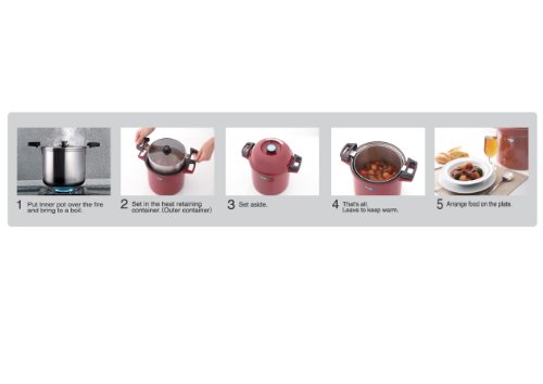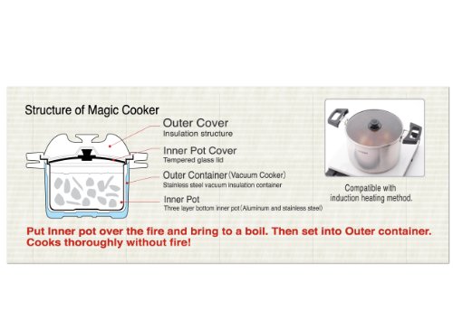 Put 4.5L(4.75qts) inner pot over the stove top and bring to a boil and set into outer container, Stainless steel vacuum insulated outer container allows the food to cook thoroughly without fire or electricity while the outside body stays cool to touch, Can keeps hot food around 154F for 6 hours, Save energy Save time, No overcooking and no burn, Dimension: 9.6L x 9.1H x 13.1W 7.3lb,Made in Japan.Feature
