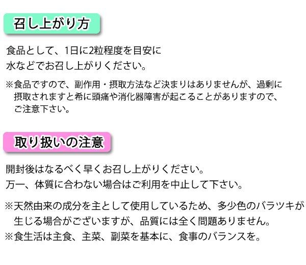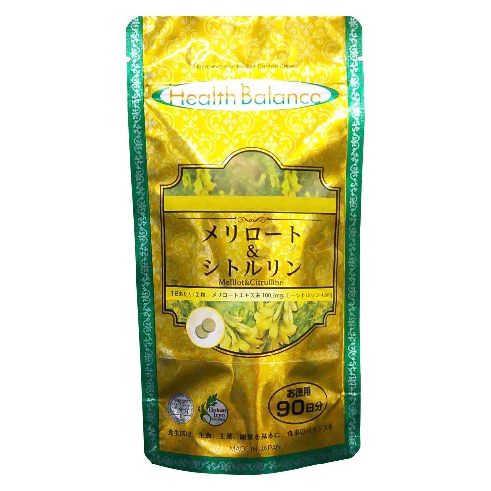 | 栄養成分 | 【2粒600mgあたり】 エネルギー:1.902kcal、たんぱく質:0.163g、脂質:0.006g、炭水化物:0.299g、食塩相当量:0.00472g 【主要成分及びその他配合量(2粒600mg.あたり)】 メリロートエキス末:100.2mg、塩化カリウム:100.2mg、L-シトルリン:42mg |