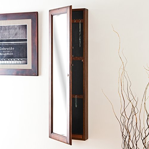 -. Feature : Stylish and modern, the design of this storage mirror is sure to enliven any space. The chrome finish helps make it the perfect fit with décor from the 50's up to modern day. / Truly a transitional and functional mirror, a single arm brace on top and bottom allow it to swivel around to reveal 3 shelves for storage. Each shelf is a different size to accommodate a wide range of toiletries and accessories. / For a really eye catching display try putting several mirrors side by side either level to each other or staggered. / The three shelves behind the mirror measure 8.5 inches wide by 4.5 inches deep and vary in height from 5 inches on the bottom, 6 inches in the middle and 8.5 inches on top. The maximum weight limit for this shelf is 25lbs. / Measures 9.75-inches wide, 4.75-inches deep and 23.5-inches high. / Wall-mounted mirror features hidden jewelry cabinet / Keeps jewelry organized and dust free / Plenty of space to hold necklaces, bracelets, earrings and rings / Available in multiple finishes to match bedroom furniture / Measures 14.63-inches wide, 4.13-inches deep and 48.13-inches high