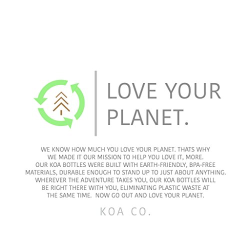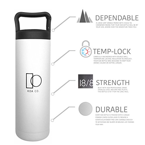 KOA Double Wall Vacuum Insulated Stainless Steel Water Bottle | Eco-Friendly, BPA-Free, Sweat-Proof, Leak-Proof | 20 oz. Dependable: This bottle is equipped with a large grip handle and a built in carabiner for easy maneuvering and dependability, wherever you are. Temp-Lock: Our Temp-Lock insulation technology is made of double wall, 18/8 vacuum insulated stainless steel. This means that your KOA bottle will keep your drinks as hot or as cold as you want them, whether you are on top of a mountain or lying on the beach. Durability: Every KOA bottle is finished with a unique powder coat outer layer to provide a scratch/slip/sweat-free grip that is durable enough to withstand just about anything. Earth-Friendly: At KOA Company, our first priority is our planet. Each KOA Bottle is engineered with earth-friendly, BPA-Free materials to help you love your planet, more.Feature