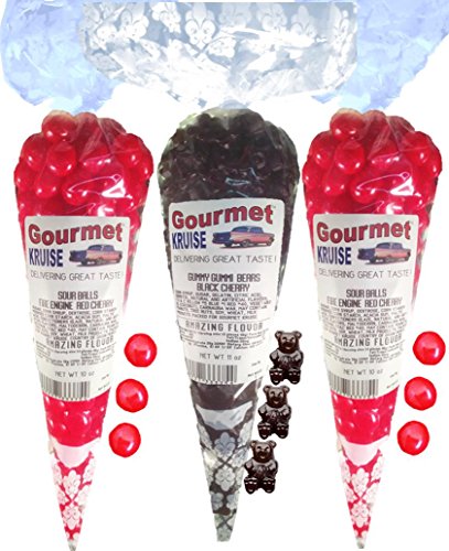 -. Title : Sour Balls (2) Fire Engine Red Cherry (1) Black Cherry Gummi Gummy Bears (NET WT 31 OZ) Gourmet Kruise Signature Gift Bags