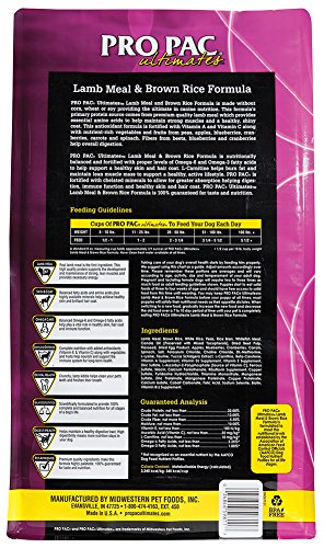 PRO PAC Ultimates Lamb Meal and Brown Rice Natural Formula contains quality protein sources, with wholesome brown rice, healthy vegetables and fruits and balanced with omega-6 and omega-3 fatty acids. This antioxidant formula is fortified with vitamins and nutrient-rich natural vegetables and fruits like peas, apples, blueberries, carrots, spinach and cranberries. By feeding PRO PAC Ultimates, you can be sure your dog is getting 100% complete and balanced nutrition. The use of these quality ingredients combined with the proper balance of amino acids, fats, carbohydrates, vitamins and minerals promote strong bones, excellent muscle tone, healthy skin and coat. Contains no corn, wheat, or soy. Formulated for dogs of all life stages. Size: 5 pounds.Feature