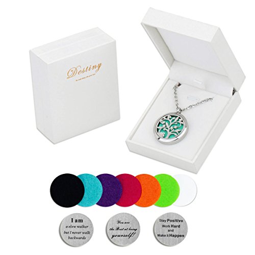 2 IN 1 NECKLACE JEWELRY - Destiny essential oil diffuser necklace locket has a tree of life pattern at front and clear glass at back. Put pad showing the front and floating charm showing the back, 2 different wearing ways in 1 diffuser necklace.