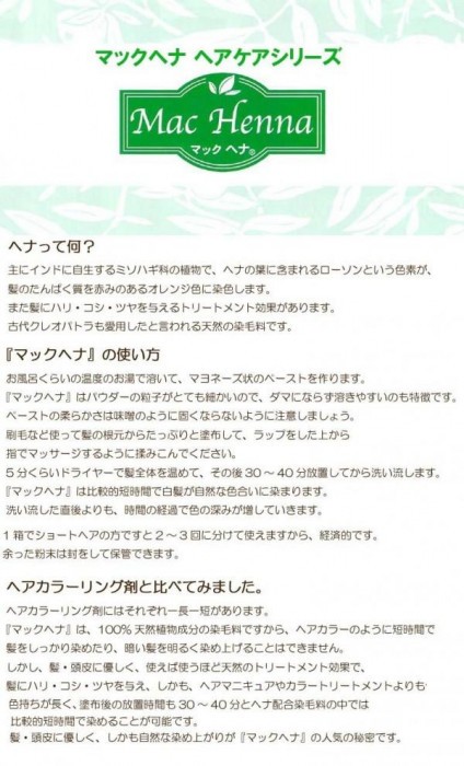「マックヘナ」で人気ナンバー1!「ヘナ」と「インディゴ」の巧みなハーモニーでブラウン系の色を実現!天然植物成分100%で、白髪をシックで落ち着きのあるブラウンに仕上げながら、抜群のトリートメント効果が得られます。天然のやさしさをぜひご堪能下さい!