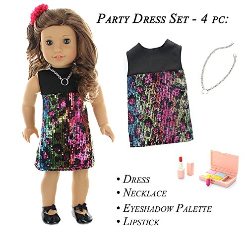 - Party Dress Set: Sequin Dress, Necklace, Eyeshadow Palette and Lipstick. FLOWER BOW NOT INCLUDED.