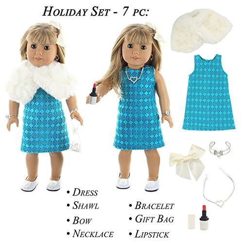 - Holiday Set: Holiday Dress, Fur Shawl, Hair Bow, Lipstick, Necklace and Bracelet.