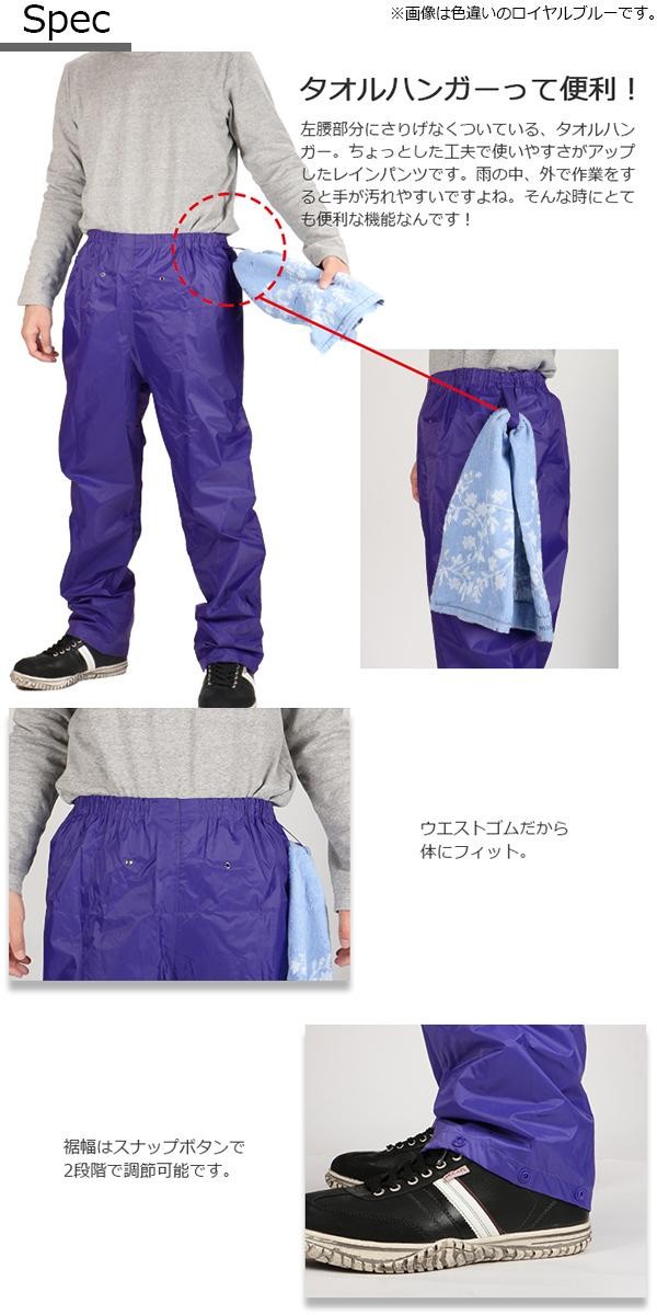 左腰にタオルハンガーが付いておりますので、作業中に手の汚れを拭くのに便利です。さらに、パンツ内に溜まった空気を素早く外に放出するためのエア抜きがついているのでムレを軽減します。上下別売りなので、サイズを別々に選びたい方や、ズボンだけ買い換えたい時にもピッタリです。 |