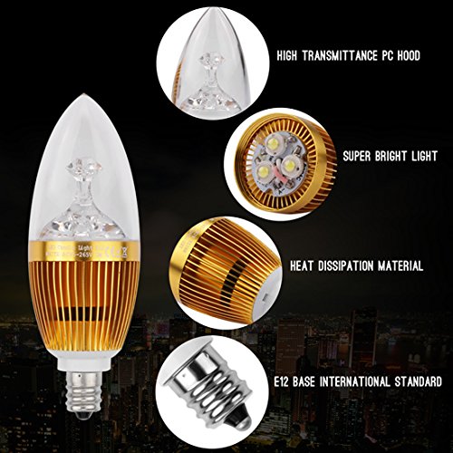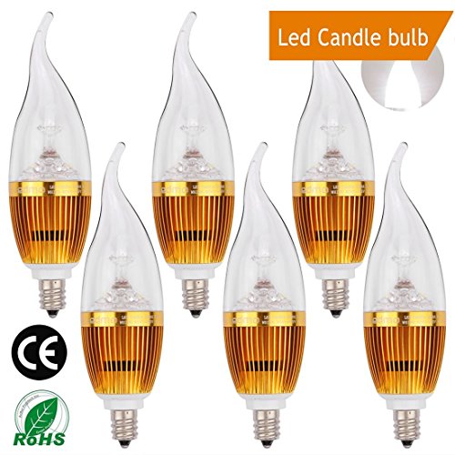 Package include:6 pcs of 3W LED E12 Candelabra Bulb (Sharp Tip) Applications: Widely used in villas, restaurants, living room, hotel and other large crystal lamps and lanterns.