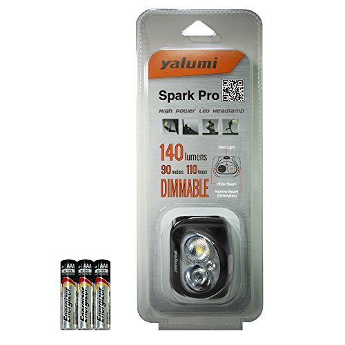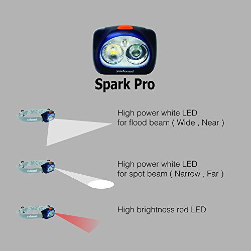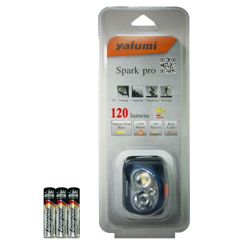 Binding : Sports Product Description The Yalumi Spark Pro headlamp offers seven operating modes by utilizing multiple sophisticated beam-enhancing optical lenses. Three AAA batteries (included) power one high-output Cree white MX-6 LED for wide-angle flood illumination; one high-power Cree white XP-E LED for long-distance, focused spot illumination; and one red LED for night vision and safety signaling. The high-output Cree white LED delivers 120 lumens in floodlight mode up to 20 meters of illumination distance. It delivers 90 lumens in focused spotlight mode and throws light up to 90 meters. The maximum burn time is 110 hours in economy mode and 48 hours on maximum mode (burn time may vary based on battery life). The red LED provides a strobe light for safety signaling and spare lighting to preserve night vision. The exceptional lens qualities in the Yalumi Spark Pro are rooted in more than 16 years of experience in engineering state-of-the-art solutions for camera lenses, video lenses, scanners and other optical products. The adjustable headband with lamp-angle tilt allows aiming of the beam. Lock mode keeps you from accidentally enabling the light--and draining the batteries--when the headlamp is stored in your pack or pocket. The headlamp also is IPX4-rated for water resistance. With a compact and lightweight design, the Yalumi Spark Pro LED headlamp is ideal for outdoor activities or for technical activities where bright, precision-focused lighting is a requirement. 0