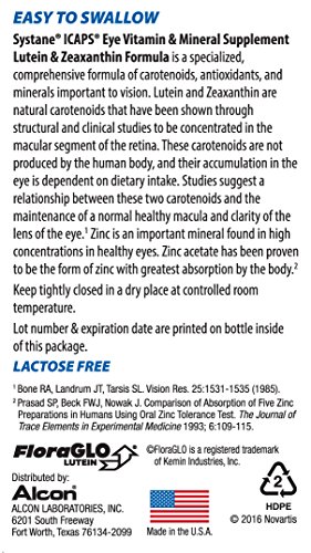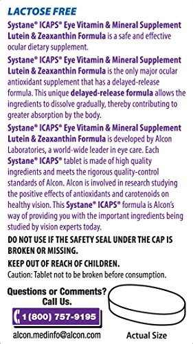 ReleaseDate : 2004-08-04 Studio : ICaps Publisher : ICaps Binding : Health and Beauty Product Description SYSTANE ICAPS Eye Vitamin Mineral Supplements are designed to support healthy eyes. The Lutein Zeaxanthin Formula is recommended for people who are interested in overall eye health and is the only major ocular antioxidant supplement that has a delayed release formula. This unique delayed release formula allows the ingredients to dissolve gradually, thereby contributing to greater absorption by the body. The suggested adult intake is one softgel per day with a meal or as directed by your physician. SYSTANE ICAPS provide a wide spectrum of important ingredients shown to support eye health and vision. Lutein and Zeaxanthin are part of a group of antioxidants called carotenoids, which are yellow, orange and red pigments synthesized by plants. Zinc is an essential trace mineral that is highly concentrated in the eyes, mostly in the retina and the underlying tissue. Vitamins A, C and E are three vitamins that scientists have identified as particularly important to eye health. Omega-3 Fatty Acids are essential fatty acids that your body uses to produce new cells, muscles, nerves and organs. With several varieties, there’s an ICAPS Eye Vitamin that fits your life. 0