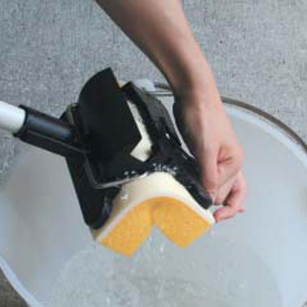 手を濡らさずに、レバー操作でスポンジを絞ることができます。柄の角度が自由になるので、壁面や曲面にもスムーズにフィットします。