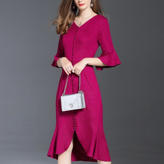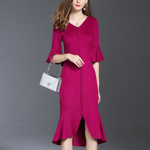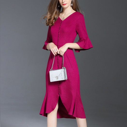 フロントスリットのミモレ丈キャンディスリーブマーメイドワンピース。