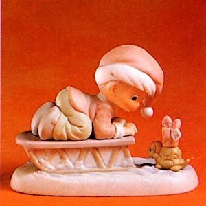 Issued in 1993 and retired in 1995. Boy on sled wearing Christmas hat, looking down at a turtle with a gift on it's back.