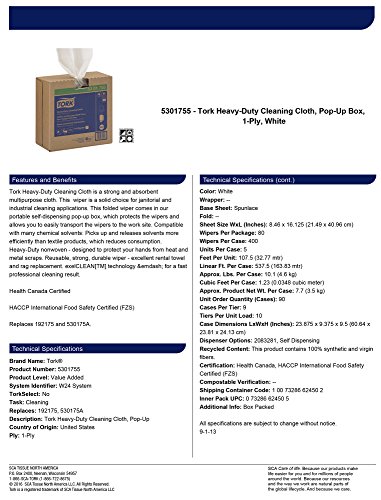 -. Title : Tork 5301755 Heavy-Duty Cleaning Cloth, Pop-Up Box, 1-Ply, 8.46" Width x 16.125" Length, White (Case of 5 Boxes, 80 per Box, 400 Cloths)