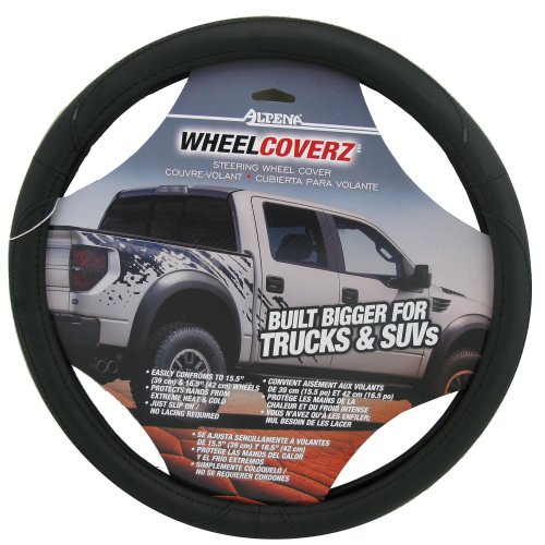 Alpena 10604 Truck/SUV Black Leather Steering Wheel Cover is specially developed for larger diameter steering wheels to fit where other steering covers will not, comfort and style has arrived for pick-up trucks and SUVs. It offers a soft touch black leather that ensures comfort while seamlessly blending with any interior. It is double-stitched for added durability. Everyone should feel good driving, and an Alpena steering wheel cover is the perfect way to enhance steering feel. Handcrafted from the finest materials in a top-rated manufacturing facility, this Alpena product is a great way to accent any interior. These steering wheel covers are easy to slip on for a secure, comfortable fit. We take pride in delivering functional and fashionable accessories to brighten any interior and make driving a positive experience. At Alpena, we push auto fashion forward and ensure the best quality and value.Feature