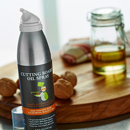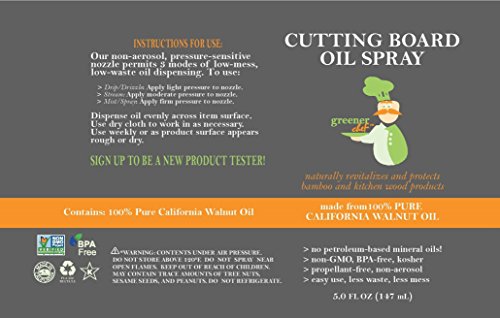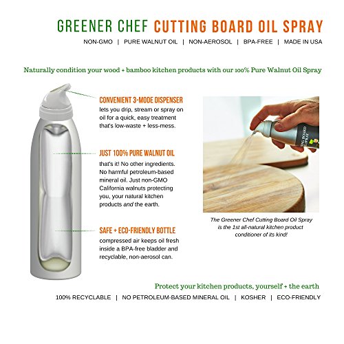 -. Feature : FOOD GRADE FOR YOU AND YOUR FAMILY'S HEALTH Our All-Natural Cutting Board Oil is Made Simply From Pure Kosher-Certified, Non-GMO Walnut Oil. That's It. Not a Trace of Mineral Oil (Petroleum). Compare to Other Butcher Block Oils Such as John Boos Mystery Oil, Howard, and John Taylor. Walnut Oil is Hands Down the Safest Way to Naturally Love Up and Care For Your Food Prep Surfaces That Come Into Contact With Your Food. Will Work With Any Hardwood Type Such As Maple, Cherry, Oak, and Acacia / MAKE YOUR LIFE EASIER WITH LESS MESS AND LOW WASTE with Our Convenient 3-Mode Dispenser That Lets You Drip, Stream, or Spray for Easy and Quick Application Saving You Time, Money! The Best Way to Naturally Condition, Preserve, and Revitalize All Bamboo Kitchenware Including Chopping Boards, Carving Boards, Knife Handles, Chopping Blocks, Wooden Utensils, Spoons, Salad Bowls, Kitchen Island Counter Tops and Even Home Furniture Cabinets. Also Our Premium Conditioning Oil Is Odorless and Tasteless / NEVER IMPORTED FROM CHINA and Only 100% Sourced and Produced in the USA in Small Handcrafted Batches with Premium California Grown Walnuts / YOU'RE DOING THE EARTH FAVOR with Our Non-Aerosol (Propellant Free) Spray That Keeps the Oil Fresh Inside a BPA-Free Bladder. You Can Also Feel Good in Knowing That Our Spray is 100% Recyclable and Eco-Friendly to the Environment / GREENER CHEF'S PROMISE to You is That If You Do Not Love This Product For Any Reason We Will Refund You Your Entire Purchase. How's That For Standing Behind Our Products? WARNING: Please Avoid Using If Allergic to Nuts