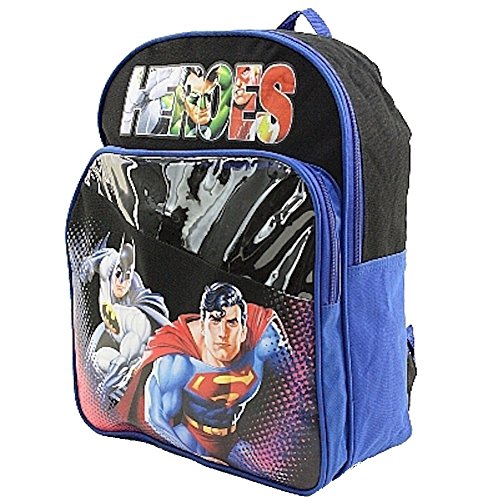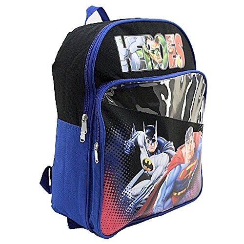 -. Binding : Apparel -. Brand : Warner Bros. -. Color : Blue -. Department : unisex-adult -. EAN : 0727379493447 -. Feature : Approximately 15 L x 13 W x 4.5 D. / Front zip compartment contains memo pad, ruler, eraser and pencils / with stationery set Pencil Eraser Ruler and memo pad Superman Batman Green latern Flash Incredible Hulk -. Label : Justice League -. Manufacturer : Justice League -. Model : A00996 -. PackageQuantity : 1 -. ProductGroup : Apparel -. ProductTypeName : BAG -. Publisher : Justice League -. Size : One Size -. Studio : Justice League -. Title : Justice League backpack Superman Batman Green latern Flash with school set -. UPC : 727379493447