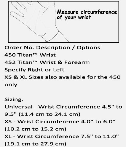 -. Binding : Health and Beauty -. Brand : Hely Weber -. Color : Black -. Feature : RIGHT Hand / Constructed of orthopedic felt, providing support and comfort. / Universal - Wrist Circumference 4.5" to 9.5" (11.4 cm to 24.1 cm) / XL and XS available, please let us know if needed. -. IsAdultProduct : 0 -. Label : Hely & Weber -. LegalDisclaimer : Please consult with your physician and/or healthcare professional P.R.Ior to placing your order. -. Manufacturer : Hely & Weber -. MPN : 450-RT -. PackageQuantity : 1 -. PartNumber : 450-RT -. ProductGroup : BISS -. ProductTypeName : HEALTH_PERSONAL_CARE -. Publisher : Hely & Weber -. Size : One Size -. Studio : Hely & Weber -. Title : 450-RT Orthosis Wrist Titan Felt Right Black Part# 450-RT by Hely & Weber Qty of 1 Unit