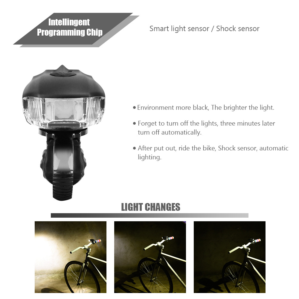 • Shock sensor,when light turn off,go on riding,the light will turn on,if you forget to turn off the light,after 3 minuters,it will be turn off itself.