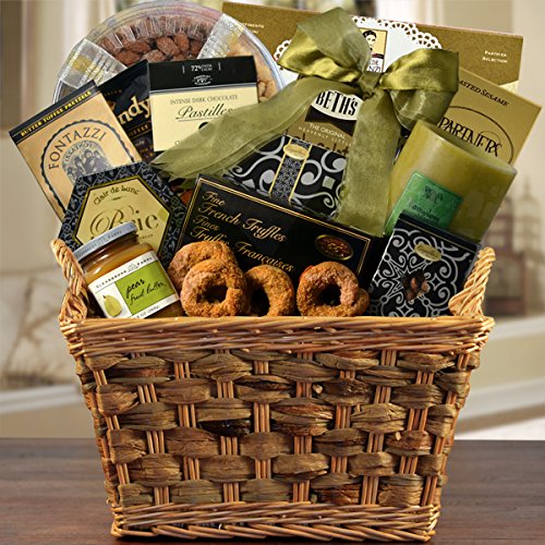 -. Feature : Brie cheese spread, Partners toasted sesame crackers, Clearbrook pear butter, Belgian chocolate truffles, Matilde Vicenzi Tesoro chocolate cream filled pastry, Chocolat Classique dark chocolate pastilles, Beth's heavenly chocolate chip cookies, Matilde Vicenzi Dolcezze cookie assortment, Candy tray with dark chocolate pretzel nuggets, assorted malt balls, cranberry raisin nut mix and mixed nuts, Coffee candy, Butter toffee pretzels, Cranberry raisin nut mix, Cashews, Candle in a glass jar / Fast, Fresh, Delicious - 100% Guaranteed! Baskets ship same day, Ground/Express, if order received before 1PM EST, M-F (except legal holidays and weekends) / Beautiful baskets designed & handmade by us in the USA. Ideal for any occasion. Free card message attached to each gift - all in your own words / 1-2 Day Ground Delivery to 21 States Nationwide. Fresh fruit can be shipped all year round via Ground delivery if it is expected to take less than three calendar days to arrive. Deliveries going further than a 3-day zone must go Express delivery. We cannot ship fruit baskets to California. / Help make a difficult time a bit easier to bear with a basket expressing your deepest sympathy.