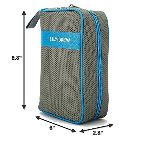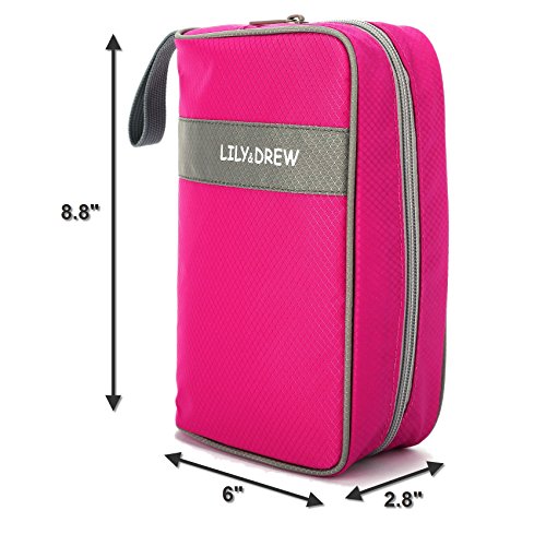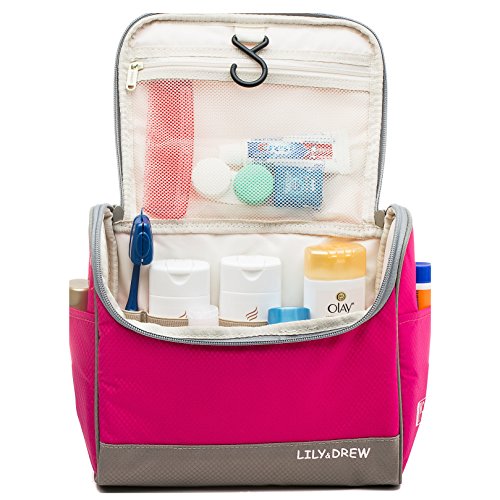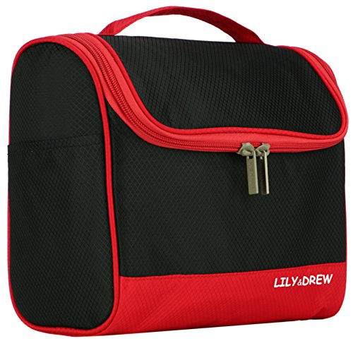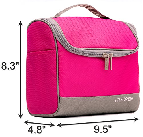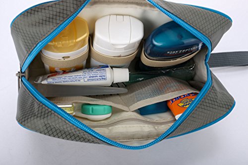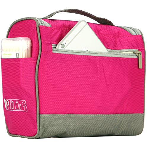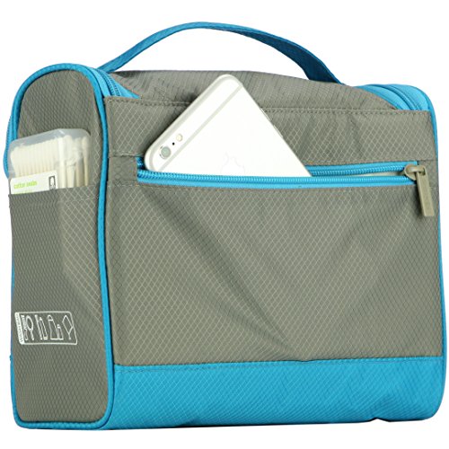 -. Feature : 3 LAYER DESIGN: Water-resistant rip-stop fabric exterior, foam padding and polyester interior lining. Unlike other thin, single-layer bags, our bag is padded so your fragile toiletries are protected during transport. Soft and light-weight material makes the bag less bulky and saves room in your lage. / HIGH FRONT WALL prevents tall bottles from spilling out while hanging (unlike some other bags). Wide elastic straps to hold large bottles and keep them in place during transport or hanging. / CONVENIENT HOOK to hang your bag from towel racks, coat hooks, door knobs, drawer pulls and other places for fast, easy access. The bag is also sturdy: it can stand alone on the counter top without falling over. / 8 POCKETS: 3 outside and 5 inside. 4 elastic straps inside. Multiple mesh pockets to organize and separate your items. Smooth-glide, easy-open zippers for quick access. Large carry strap on top for easy handling. / LARGE INTERIOR volume holds all your travel toiletries, cosmetics,shaving accessories and more. Great for travel, business, leisure, camping, vacation, the gym, short trips, dorm room shower or general daily use. Size: 9.5in wide x 8.3in tall x 4.8in deep.