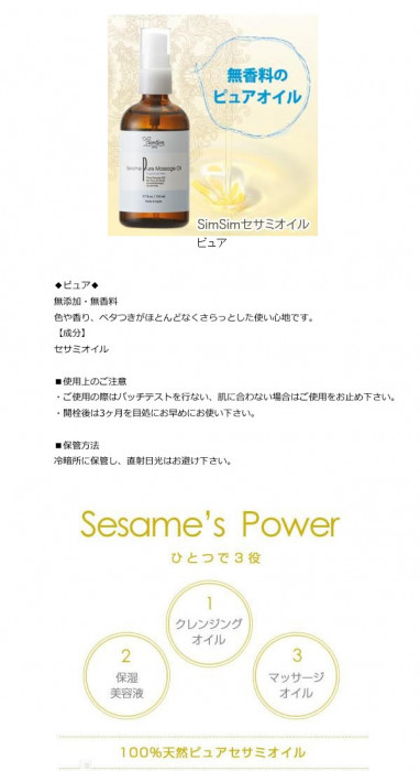SimSimセサミオイルは、圧搾機を使い、ゴマを押しつぶして油を搾り出した後、和 紙や布などでろ過を繰り返す圧搾法で抽出。専用の窯を使い、キュアリング(加熱処理)を行っています。ベタつかず、サラッとした使い心地なので、クレンジ ングオイル・美容液・保湿液・マッサージオイルなどとしてお使いいただけます♪