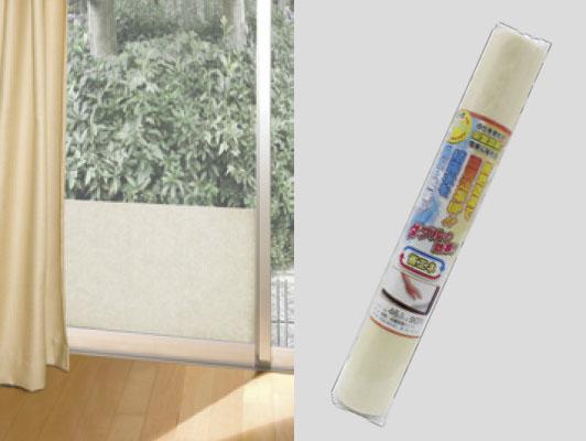 自粘着性品(水貼りタイプ)です。窓ガラスに貼って窓から伝わる冷気をカット、暖房効果を高めます。また、結露水を吸収して乾燥します。