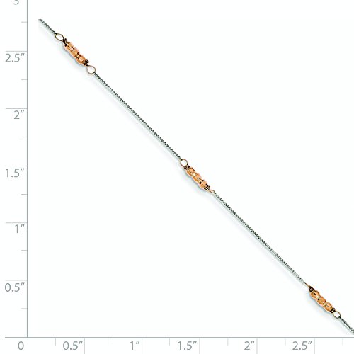 SPECIFICATIONS: Jewelry Type: Anklets, Chain Type: Ball (Beaded), Anklet Type: Anklets with Stations, Material: Primary: Gold, Material: Primary - Color: Two-Tone, Material: Primary - Purity: 14K, Finish: Polished, Chain Length: 9 in, Chain Width: 2mm, Clasp /Connector: Spring Ring, Feature(1): Adjustable, Texture: Diamond-cut