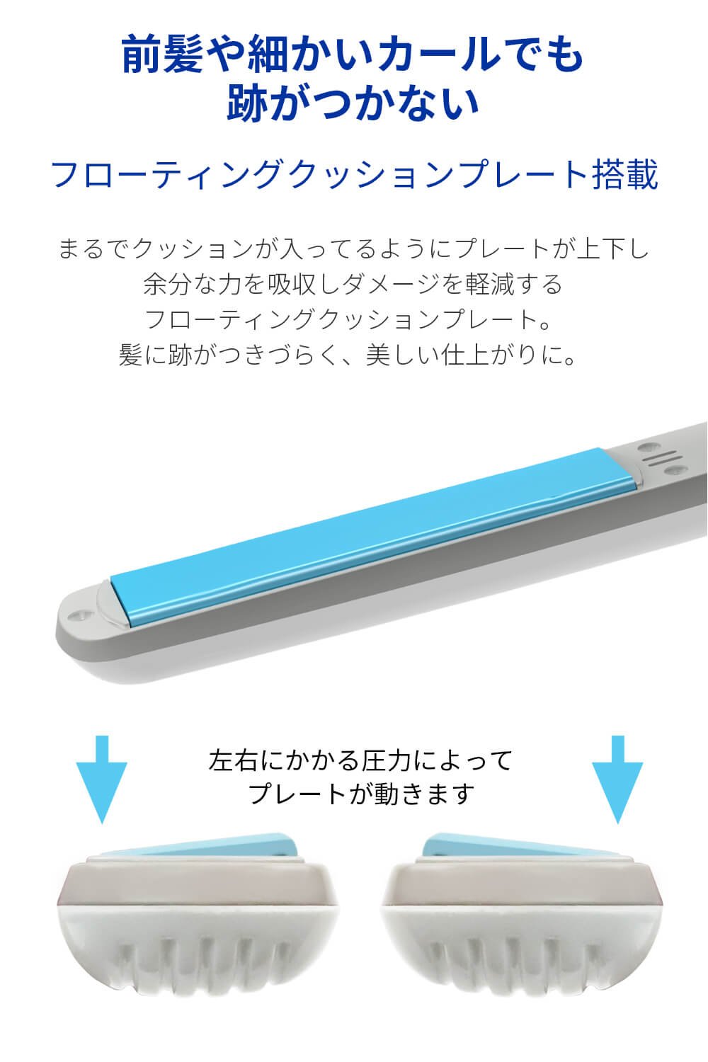 新感覚フローティングクッションプレートを採用。プレートがスタイリング時の動きに合わせ非常に柔軟に動き、髪への無駄なダメージを軽減。カーブをつけたい時も跡がつかない。