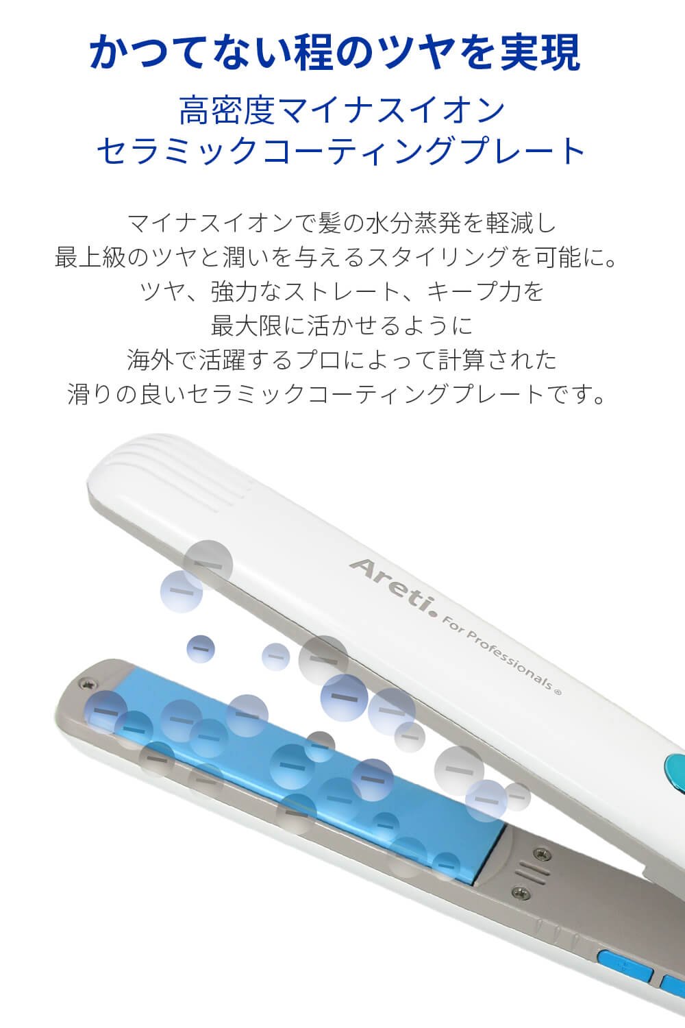高密度セラミックコーティングから大量のイオンを放出! 髪の水分蒸発を軽減し、ダメージを最小限に。うるおいと艶を与えます。